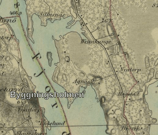 Byggningsholmen etablerades 1866 då änkan och fattighjonet Ingeborg Johannesdotter (f 1795) flyttade dit tillsammans med änklingen Nils Peter Nilsson (f 1815 i Växjö) och hans nya hustru Annika Arvidsson (f 1808 i Vederslöv – död 1871). De flyttade till Byggningsholmen från Uråsa socken. Nils Peter kallades i folkmun för ”Nisse på holmen” och blev som 14-åring straffad för stöld (1829).