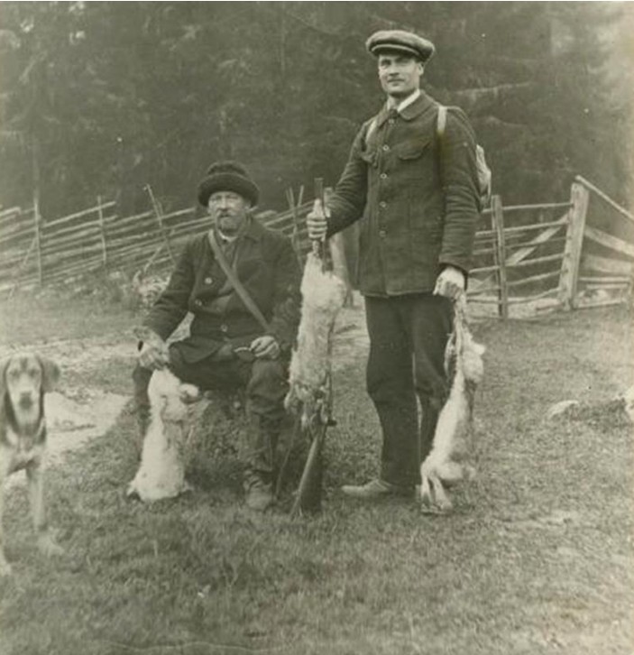 Knut Berg till höger, på harjakt med lokföraren Möllerberg (sittande) som tillsamman med lokföraren Johansson köpte Hagstad Norregård på kronans auktion 1902.