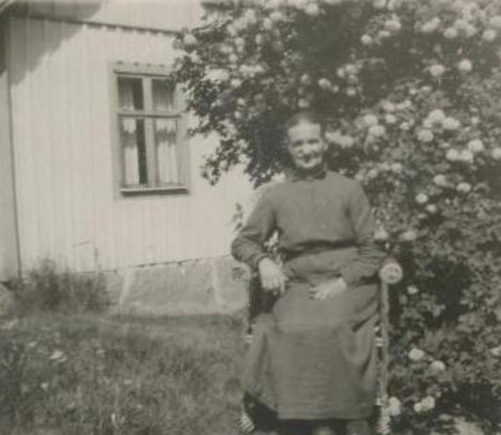 Granelund med tillbyggd affärslokal till vänster, Tilda Berg stående till vänster om entrédörren, Foto sannolikt från omkring 1930.