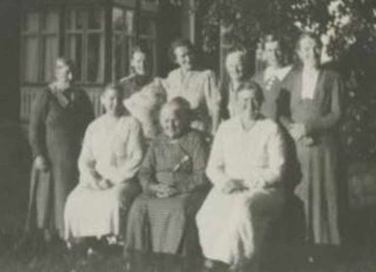 Malena sitter i mitten (grå klänning). Foto 1940-talet, kaffebjudning i Hagstad Norregård.